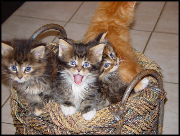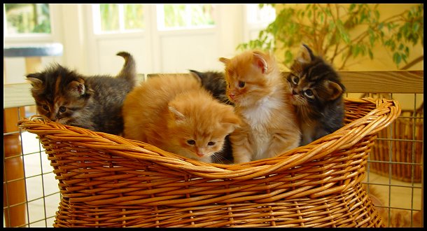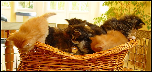 4 von 5 Babies im Spielzeugkorb. Kater Endless Love ist wie immer mittendrin! Er lebt bei uns. Links von ihm seine Schwester Efi, die bei unseren Freunden, den Snakevalleys lebt. |